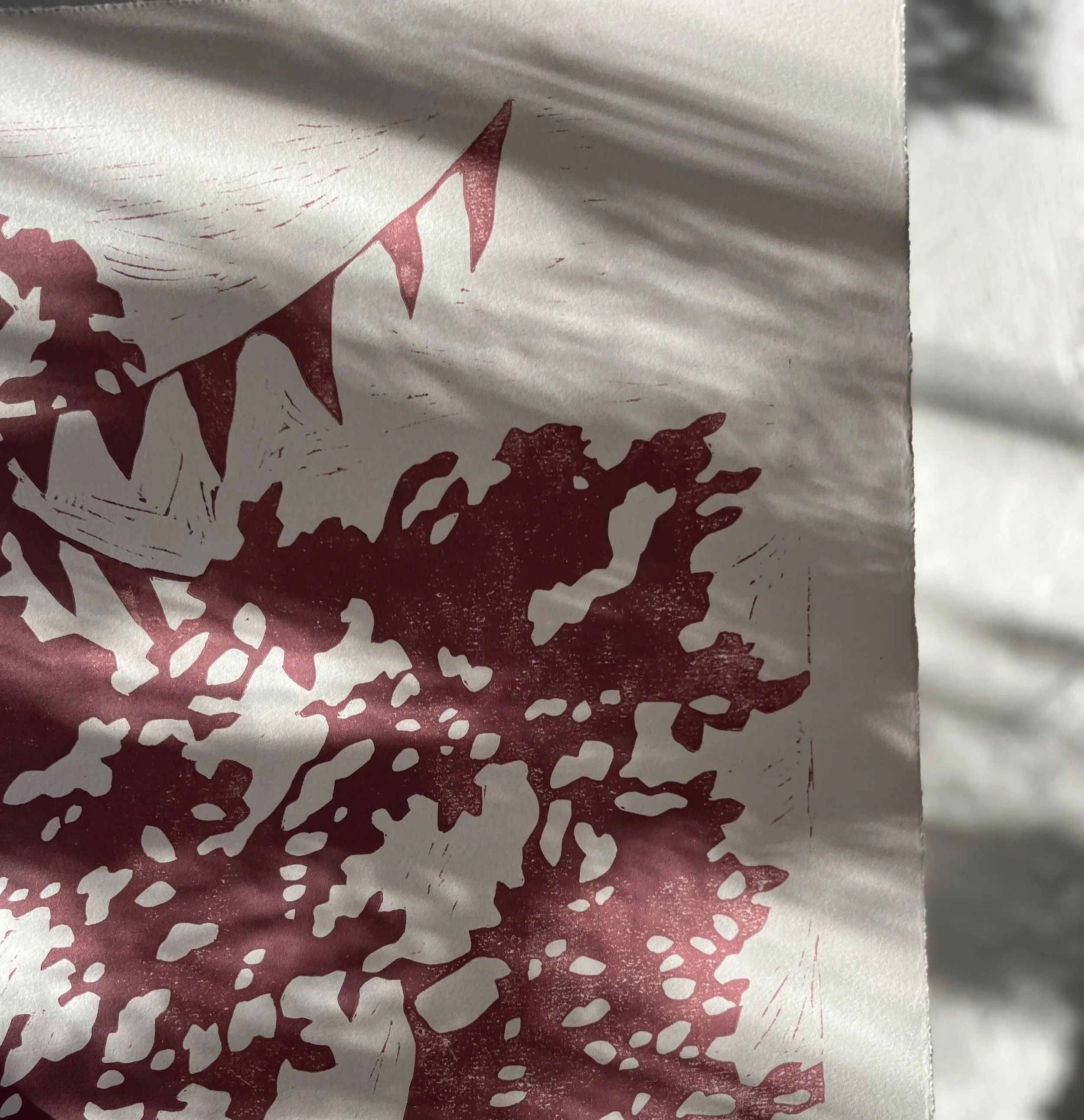 Der eigentlich ganz grafische Linoldruck wird nie ganz gleichmäßig und oft lasse ich ganz bewusst noch Schnittkanten stehen.