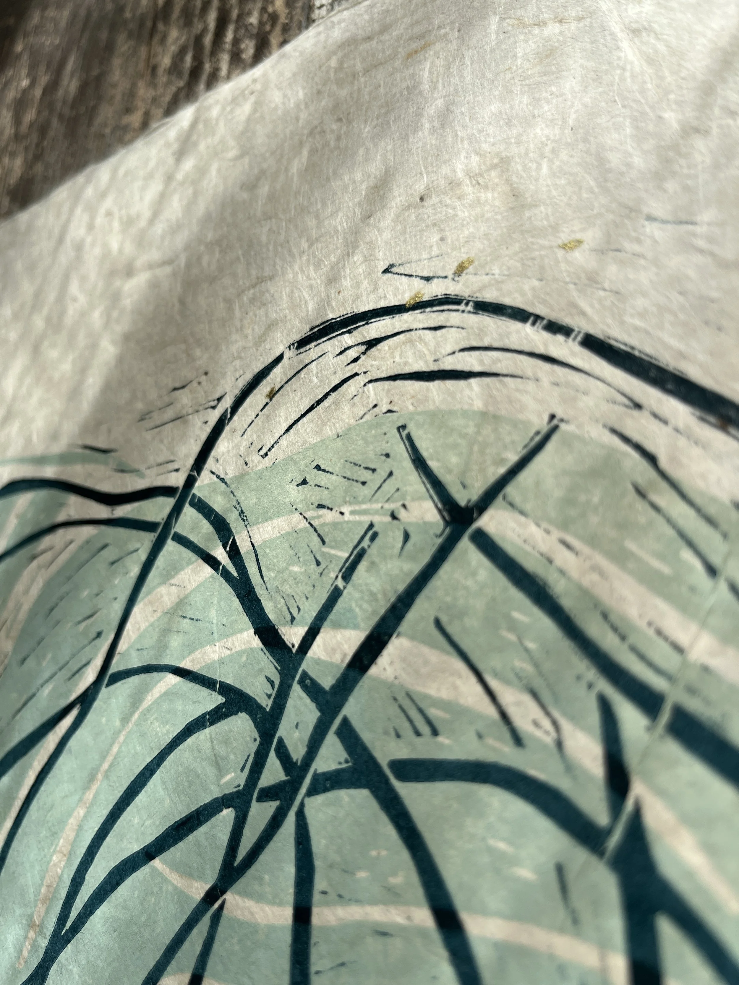 Jedes Motiv wird von mir entworfen und von Hand geschnitzt. Für jeden einzelnen Abzug wird die Farbe neu mit der Walze von Hand auf den Druckstock aufgetragen.
