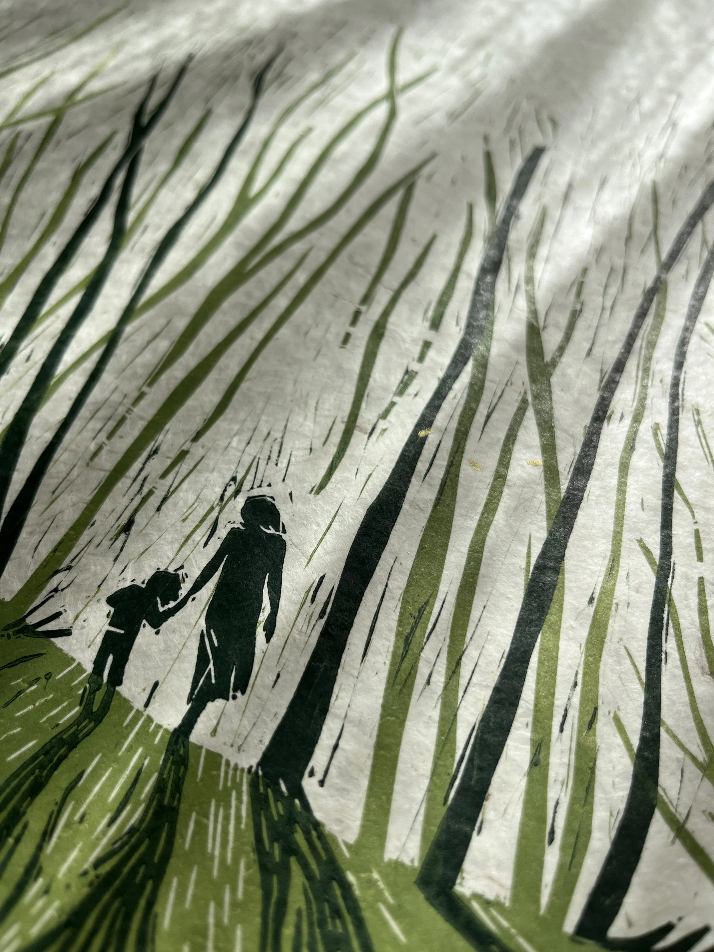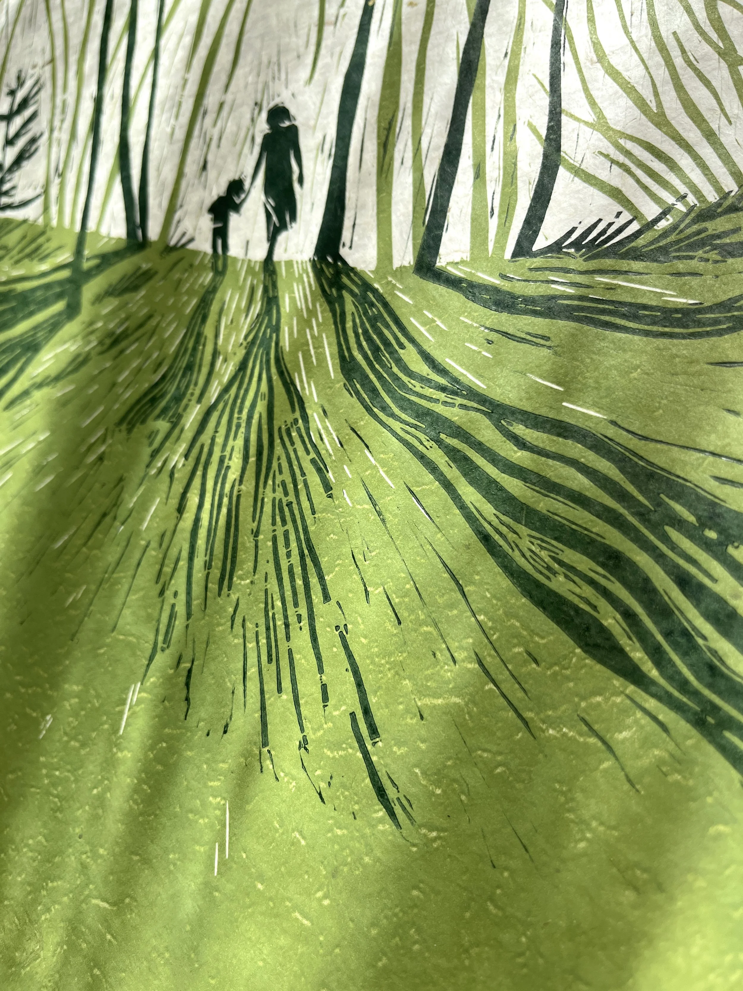 Die feinen Linien, die beim Schnitzen entstanden sind, drucke ich mit - und fange die Sonnenstrahlen ein, die zwischen den Bäumen durchblitzen.